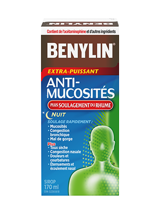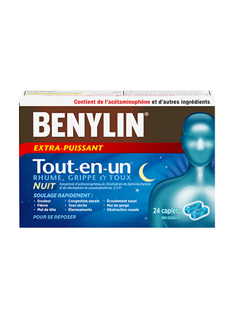 Les remèdes maison pour le rhume et la toux ne suffisent pas? Soulagez vos symptômes de rhume, de toux et de grippe avec les produits Benylin® pour la nuit. La congestion nasale, la toux sèche et le mal de gorge font des siennes? Nos produits en vente libre sont efficaces et agissent rapidement. Choisissez des produits pour la nuit au bon goût et spécialement formulés pour aider à maîtriser la toux et la fièvre de votre enfant, pour lui permettre de mieux dormir. Pour connaître la dose appropriée des produits Benylin® pour enfants et pour adultes, cliquez sur le produit pertinent et consultez la rubrique Mode d’emploi. Soyez inébranlable.